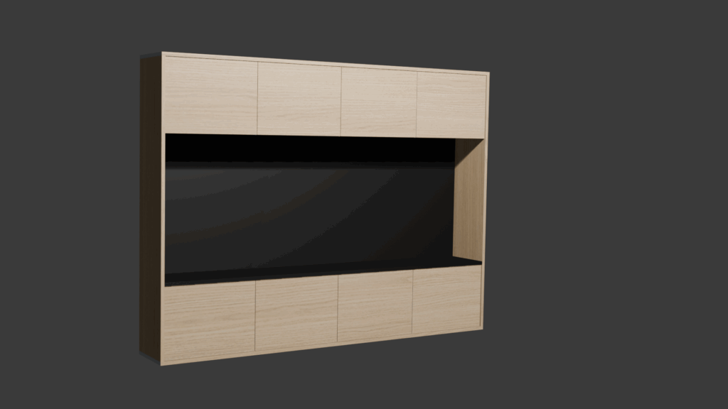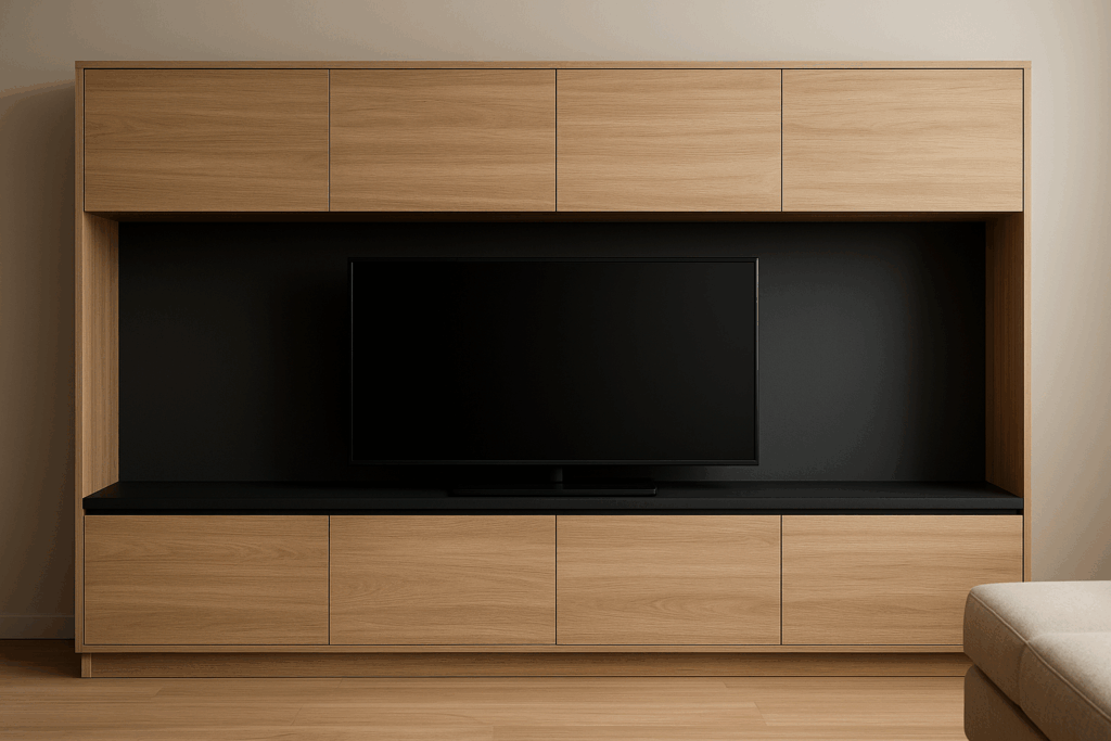 « Je veux la photo d’un aménagement de salon en mélaminé, avec des portes longues en bois horizontal, une partie basse (portes décors bois puis plan de travail noir). Une partie centrale en niche pour recevoir la tv en noir »